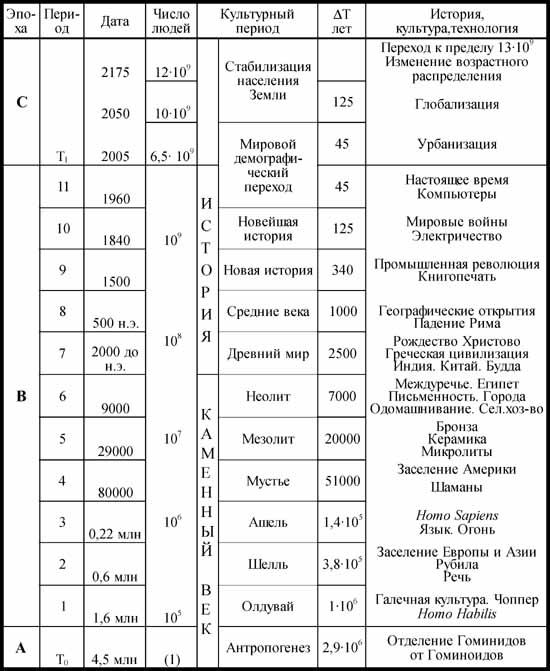 В табл. 5.2, построенной в логарифмическом масштабе, времена отсчитываются от настоящего времени -- фактически уже от критической даты T1=2005 г. Таким образом хронология, приведенная в курсе археологии Фачинни [41], практически точно следует расчетной, которая уже на всем протяжении развития человечества показана в следующей табл. 5.3. Эта таблица подытоживает весь путь развития человека -- от раннего антропогенеза до предвидимового будущего.