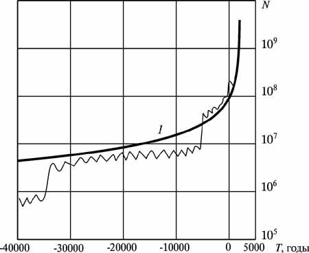 Рис. 5.2 Рост населения мира начиная от 40,000 лет тому назад: 1 -- модель [59]