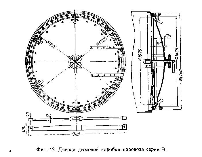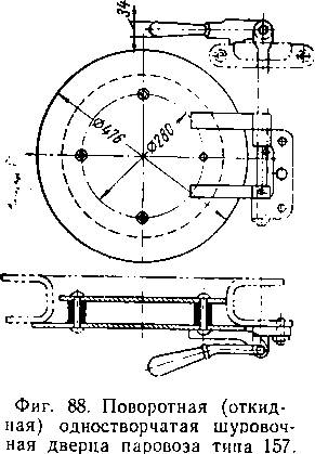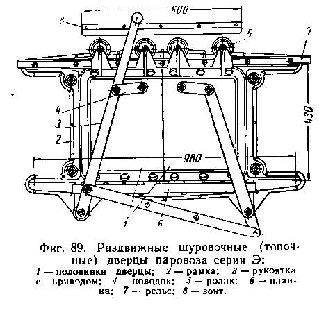Поэтому на паровозах более поздней постройки (СО, Э, 9П, Т-48, ГР) применяются двустворчатые раздвижные дверцы (фиг. 89), где створки одновременно раздвигаются в противоположные стороны при помощи системы рычагов. В открытом положении такая дверца не мешает бригаде, так как перемещается в плоскости лобовой стенки.