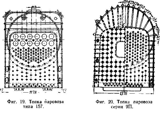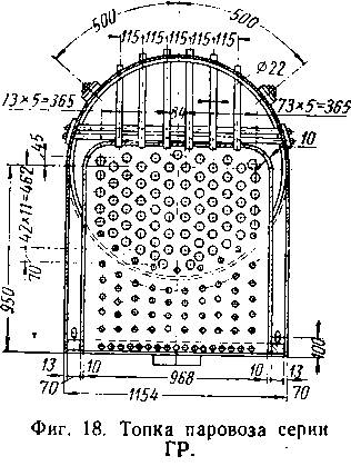 1. С полукруглым потолком кожуха и с плоским потолком огневой коробки (фиг. 18). Такие топки установлены на паровозах серий О, Н, ГР, ОП-2 и типа 159.