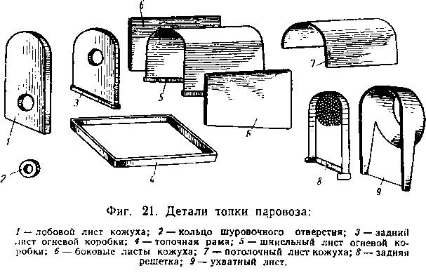 Кожух топки. Кожухом топки называют часть котла, окружающую огневую коробку. Устройство кожуха топки мало отличается от устройства огневой коробки. Кожух состоит из листов: лобового (фиг. 21), двух боковых, потолочного и ухватного. Верхние загибы