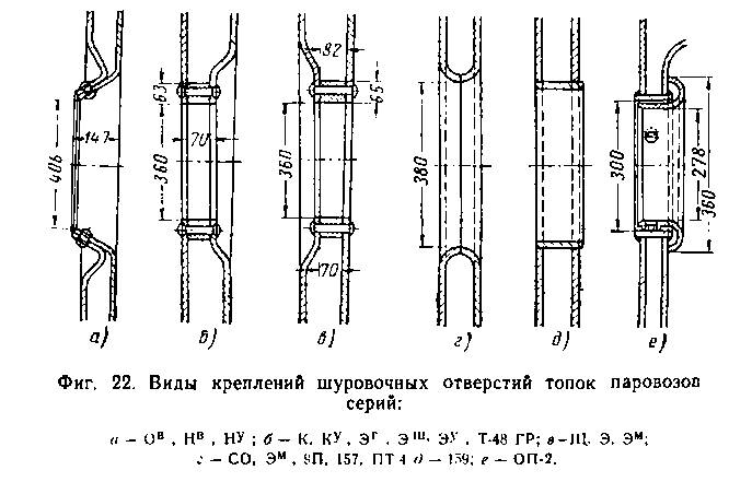 Крепление шуровочного отверстия у паровозов разных, типов различное (фиг. 22). Связями скрепляют заднюю стенку огневой коробки с лобевым листом кожуха топки, боковые стенки между собой и подрешеточную часть огневой решетки с ухватным листом кожуха топки. Связи разделяются на вварные и нарезные, материалом для которых служит прутковая мартеновская сталь Ст. 1, Ст. 2 и Ст. 3 ло ГОСТ 536-53.