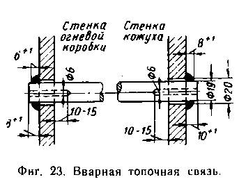 Отверстия в кожухе и топке нарезаются специальным длинным метчиком. Постановка связей производится со стороны кожуха специальным ключом. Связь, установленная на место, обязательно расклепывается со стороны огня, а иногда и с обеих сторон. Теперь на всех паровозах как система ввариваются топочные связи (фиг. 23), имеющие форму гладкого цилиндрического стержня.
