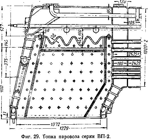 На узкоколейных паровозах серии ВП-2 потолок огневой коробки выполнен волнистым, толщиной 22 м (фиг. 29); поэтому потолочные связи в этом паровозе не ставятся.