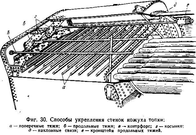 Таких поперечных тяжей обычно два ряда, а в некоторых радиальных топках один. Лобовой лист укрепляется продольными тяжами, контрфорсами и скрепляется с потолком кожуха стальными