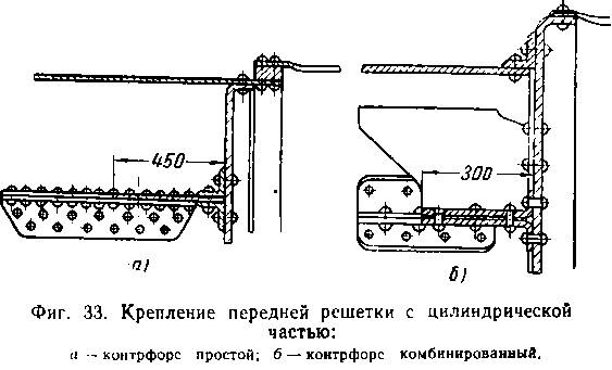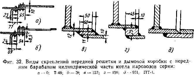 Такйе способы укрепления решетки применены на старых паровозах широкой и узкой колеи. На всех новых паровозах передняя решетка приваривается к внутренней части барабана. В этом случае решетка делается из стального листа толщиной от 13 до 25 мм, диаметром на 4—5 мм м’еньше внутреннего барабана (фиг. 32, в, г, д).