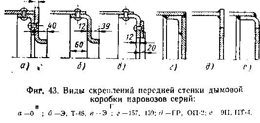 Скрепление огневой коробки. Плоские стенки и потолок топки под давлением пара испытывают большое усилие, которое изменяет форму топочных листов. Для сохранения правильной формы стенки огневой коробки и кожух топки скрепляются между собой топочной или обвязочной рамой, креплением у шуровочного отверстия, боковыми и потолочными связями. Кроме того, задняя решетка скрепляется с передней решеткой дымогарными и жаровыми трубами. Топочная рама соединяет листы огневой коробки и кожуха топки в нижней части. Листы топки скрепляются с топочной рамой заклеп-