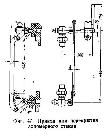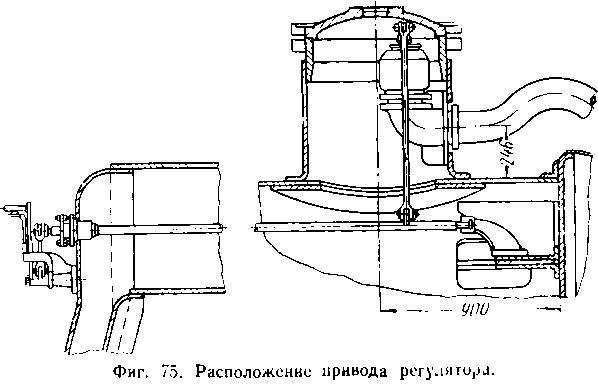 рычагов и валов (фиг. 75). Регуляторный вал, расположенный внутри котла над потолком огневой коробки, соединяется тягой и рычагом с регуляторным золотником или клапаном, и задним концом проходит через сальник на лобовом листе кожуха топки. На задний конец вала надевается рукоятка (паровозы узкой колеи и танк-паровозы широкой колеи) или рычаг, который соединяется с рукояткой посредством тяги (паровозы СО, Э).