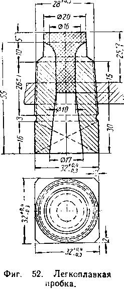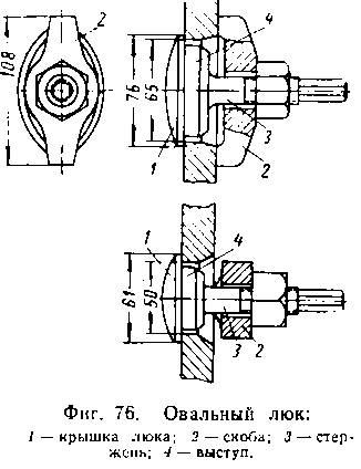 Отверстия небольшого диаметра закрываются пробками, ввернутыми на резьбе в тело кожуха или втулки, приваренной или поставленной на резьбе. Такая пробка, несмотря на свою простоту, имеет существенный недостаток, заключающийся в прикипании резьбы, вследствие чего затрудняется вывертывание ее и порча резьбы. Ввиду указанных недостатков конические пробки распространения не получили, а вместо них ставятся специальные пробки-люки (фиг. 78).