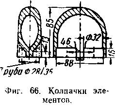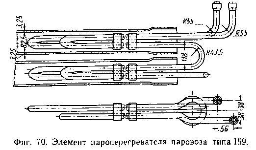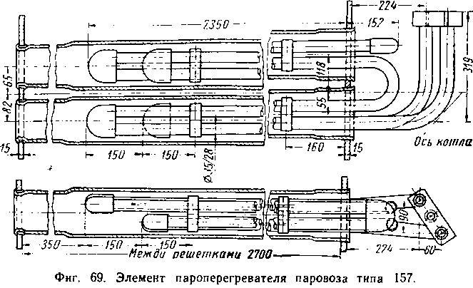 Элемент пароперегревателя паровоза 157 (фиг. 69) состоит из отдельных цельнотянутых труб наружным диаметром 35 мм, соединенных между собой специальными колпачками. Стенки колпачков для увеличения износостойкости делают утолщенными. При сборке элемента колпачок надевается на концы труб и обваривается. Элемент соединяется с коллектором посредством двух нижних трубок.