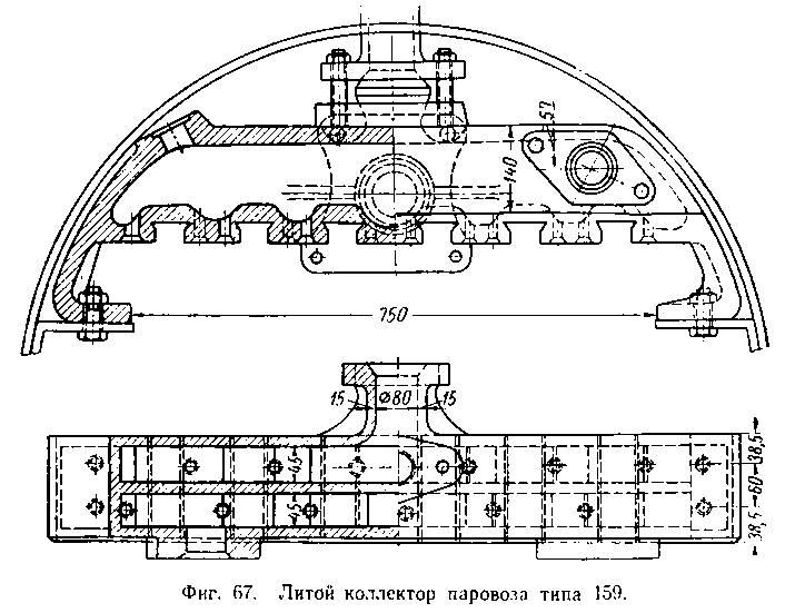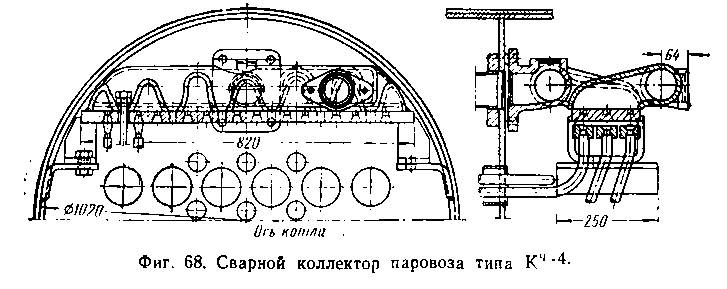 На паровозе типа 159 трубки элементов наружным диаметром 24 мм не имеют колпачков и соединяются с коллектором посредством двух верхних трубок (фиг. 70).