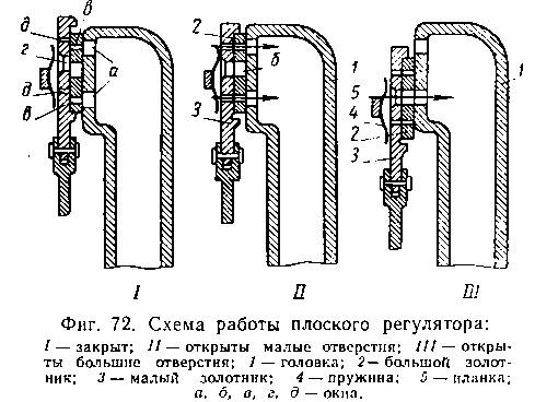 которой перемещается большой плоский золотник 2. На спинке большого золотника 2 сделан узкий вертикальный прорез (паз), в котором перемещается малый, или разгрузочный плоский золотник 3. Большой золотник 2 имеет посередине одно большое окно б, одинаковое по форме с окнами а регуляторной головки, и два узких разгрузочных окна в. Малый золотник 3 имеет также одно большое окно г и два узких окна д. Когда оба золотника находятся в крайнем верхнем положении (фиг. 72, ), то в регуляторной головке