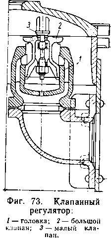 На паровозах серий СО, Э и других установлен двухклапанный регулятор (фиг. 73), состоящий из бочкообразной головки А внутри которой имеется разгрузочная камера с дном, соединенная с корпусом головки вертикальными ребрами, и двух клапанов: большого 2 и малого или разгрузочного 3.