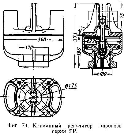 На узкоколейных паровозах типов 157 и 159, ПТ-4 и К4 -4 установлены клапанные регуляторы, аналогичные описанному (выше, только регуляторная головка у них отлита вместе с регуляторной трубой. На паровозах серий ГР и ОП-2 установлен клапанный регулятор, изображенный на фиг. 74.