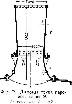 Цз различных конструкций дымовых труб наибольшее распространение имеют составные трубы (фиг. 79), состоящие из седалища / и самой трубы 2, соединенных между собой и с дымовой коробкой болтами. Такие трубы встречаются на многих промышленных паровозах широкой и узкой колеи. Применяются также составные трубы, у которых седалище оканчивается снизу раструбом, входящим внутрь дымовой коробки. Кроме того, применяются цель-