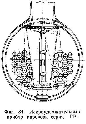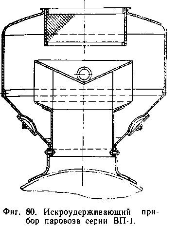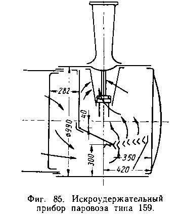 Исследования показали, что лучшим искроудержательным прибором является дефлекторный в комбинации с сетчатым усеченным конусом, установленным между конусом и дымовой трубой. Таким прибором оборудована часть паровозов типа 159 узкой колеи (фиг. 85).