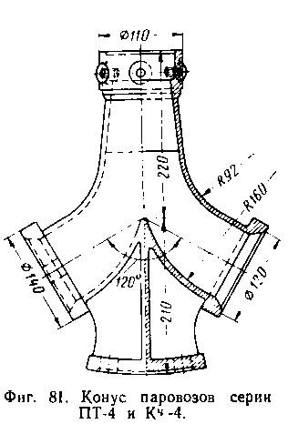 Конус (фиг. 81) представляет собой короткую трубу конического сечения или тройник, расположенный в дымовой коробке непосредственно под дымовой трубой. К конусу присоединяются трубы, от-* водящие отработавший пар из цилиндров паровой машины.