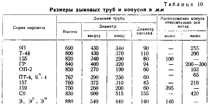 На каждом паровозе конус устанавливается на определенной высоте по отношению к оси котла, а диаметр конусного насадка для каждого паровоза принимается в зависимости от рода топлива и других местных условий (табл. 10).