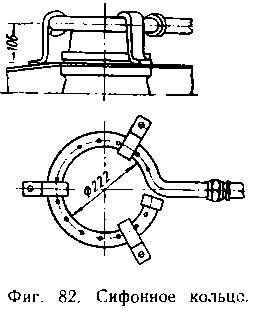 Для создания тяги на стоянках и во время движения при закрытом регуляторе применяют сифон, который представляет собой изогнутую кольцом трубку (фиг. 82). В верхней части по окружности кольца располагаются отверстия диаметром 3—5 мм. Для правильной работы сифона необходимо, чтобы сумма площадей всех отверстий сифона была несколько меньше площади сечения трубки, подводящей пар к сифону.