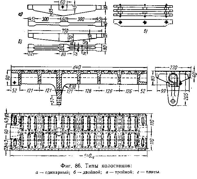 Колосники по конструкции делятся па одиночные, двойные, тройные и колосниковые плиты (фиг. 86). Колосники одинарные, двойные и тройные, называемые брусковыми — неподвижные; колосниковые плиты — подвижные или качающиеся.