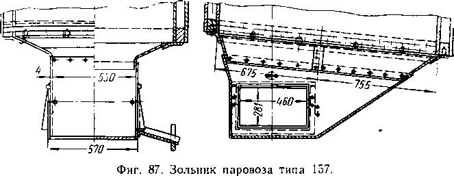 Зольник (поддувало) — это железная коробка, прикрепленная к топке снизу (фиг. 87), служащая для удерживания золы и горячих углей от попадания на путь, а также для регулирования количества поступающего в топку воздуха. В стенках зольника устроены дверцы или клапаны, которые можно открывать и закрывать при помощи рычагов, выведенных в будку машиниста. Форма зольника зависит от расположения топки относительно рамы паровоза и колесных осей. Это приводит к большому разнообразию конструкции золотника..