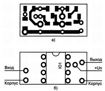 Рис. 25. Печатная плата (а) и расположение элементов (б) миниатюрного усилителя