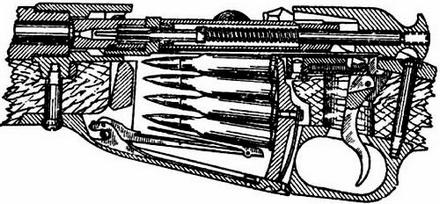 Магазин Вельтильщева представлял собой плоскую металлическую коробку, в которой патроны лежали горизонтально и через щель в коробке подавались пружиной, образующей нижнее дно магазина. В нем помещалось три патрона, четвертый лежал в передней части, а пятый находился в патроннике. Подобно магазину американца, Ли, магазин Вельтищева являлся самым совершенным, и по его принципу впоследствии строились магазины многих конструкторов, принятые в армии. Но переделка «берданки» по этой системе являлась делом сложным и дорогим и влекла замену многих частей винтовки[325].