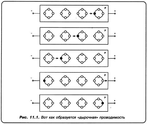 «С»: Ну конечно! У него образуется незаполненная ковалентная связь, которая ВСЕГДА готова принять свободный электрон. И она его принимает… от соседнего атома германия (либо кремния)! Вот почему эту вакансию или брешь в физике полупроводников почетно именуют ДЫРКА! А теперь обратите внимание на рис. 11.1, который показывает фазы ДЫРОЧНОЙ ПРОВОДИМОСТИ, когда к полупроводнику p-типа (positive — положительный) приложено напряжение.
