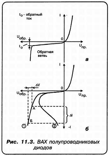 «С»: Совершенно с вами согласен. Об этом и поведем разговор. Но, прежде чем это сделать, приведем вольт-амперную характеристику (ВАХ) для кремниевого диода малой мощности. Обратите внимание, что обратная ветвь характеристики при достижении некоторого Uобр, имеет участок параллельный оси ординат (рис. 11.3, а).