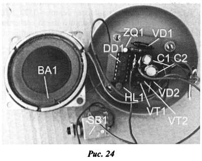 Большинство деталей монтируют на печатной плате из односторонне фольгированного стеклотекстолита, размерами 40 мм на 40 мм (рис. 24).