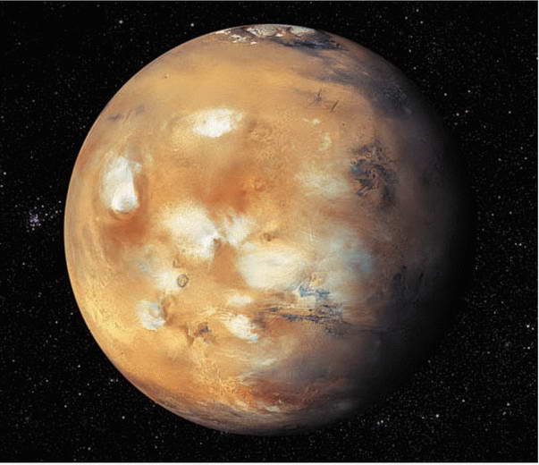 Марс выглядит на ночном небе как яркооранжевая звезда. Цвет планеты определяют красные оксиды железа, присутствующие в поверхностных породах.