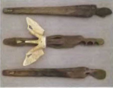 Предметы охотничьего вооружения морских зверобоев древней Арктики: копъеметалки и стабилизатор гарпуна – «крылатый предмет». Дерево, моржовый клык. Первое тысячелетие нашей эры.