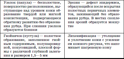 4) типичная картина кожных высыпаний: краснота, появление на этом фоне мокнущих пузырьков, узелков, сухости, трещин, шелушения и др. (табл. 19);
