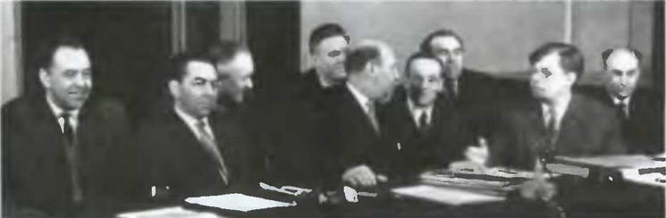 Первая дирекция ОИЯИ на V сессии Ученого совета (слева направо): К Даныш, В. П. Джелепов, В. Вотруба, В. Н. Сергиенко, Д. И. Блохинцев, В. И. Векслер, А. К Рыжов, Н. Н. Боголюбов, Г. Н. Флеров
