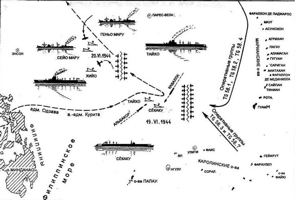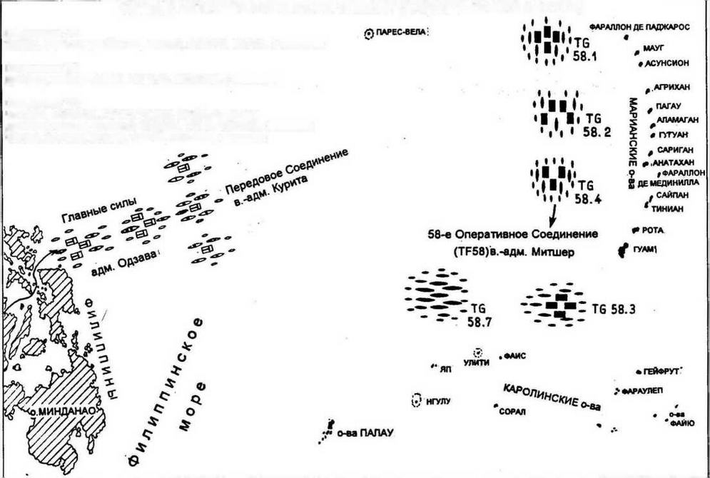 После серии удачных десантных операций американцы нацелились на Марианские острова - один из ключевых пунктов внутреннего периметра японской обороны. Оттуда их дальние бомбардировщики уже могли бы доставать не только все Филиппины, но и острова японской метрополии. Начать было решено с островов Сайпан и Тиниан - одних из самых крупных и находившихся рядом друг с другом. Как и в предыдущих десантных операциях первый удар наносила палубная авиация: по аэродромам, портам и сооружениям противника в районе будущей высадки. Затем в дело вступала артиллерия тяжелых кораблей и только потом высаживался десант. Линкоры и крейсера, а также самолеты эскортных авианосцев продолжали оказывать войскам непосредственную поддержку, а ударные авианосцы занимались атакой тех баз противника, откуда он мог выслать подкрепления или нанести удар по местам высадки и линиям подвоза снабжения. В соответствии с этим 5-й Флот США организационно делился на силы вторжения (десантные суда и транспорты с эскортом и вспомогательными кораблями), силы поддержки (старые линкоры, эскортные авианосцы, крейсера, эсминцы) и силы прикрытия (ударное соединение из авианосцев, быстроходных линкоров, крейсеров и эсминцев). В роли последнего выступало соединение TF58 вице- адмирала Марка Митшера (флаг на авианосце «Лексингтон»), при проведении операции «Форэйджер» (захват Марианских островов) разбитое на 5 оперативных групп: TG58.1 контр-адмирала Дж. Кларка (авианосцы «Хорнет», «Йорктаун», «Белью Вуд», «Батаан», 3 тяжелых, 2 легких крейсера, 14 эсминцев), TG58.2 контр-адмирала Э. Монтгомери (авианосцы «Банкер Хилл», «Уосп», «Монтерей», «Кэбот», 3 легких крейсера, 12 эсминцев), TG58.3 контр-адмирала Дж. Ривза (авианосцы «Энтерпрайз», «Лексингтон», «Сан Джасинто», «Принстон», 1 тяжелый и 4 легких крейсера, 13 эсминцев), TG58.4 контр-адмирала У. Хэррилла (авианосцы «Эссекс», «Лэнгли», «Коупенс», 4 легких крейсера, 14 эсминцев) и TG58.7 вице-адмирала У. Ли (7 быстроходных линкоров, 4 тяжелых крейсера и 13 эсминцев).