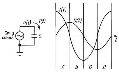 На интервалах А и С на конденсатор поступает некоторая мощность (правда, скорость ее изменения переменна), и благодаря этому он заряжается: накапливаемая конденсатором энергия увеличивается (мощность — это скорость изменения энергии). На интервалах В и D потребляемая мощность имеет отрицательный знак — конденсатор разряжается. Средняя мощность за период для нашего примера равна нулю; этим свойством обладают все реактивные элементы (индуктивности, конденсаторы и всевозможные их комбинации). Если вы знакомы с интегралами от тригонометрических функций, то следующее упражнение поможет вам доказать это свойство.