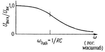 Диаграмма соответствует такой частоте, при которой модуль реактивного сопротивления конденсатора равен R, т. е. f = 1/2πRC. Из диаграммы видно, что отношение выходного напряжения ко входному составляет 1/√2, т. е. — 3 дБ.