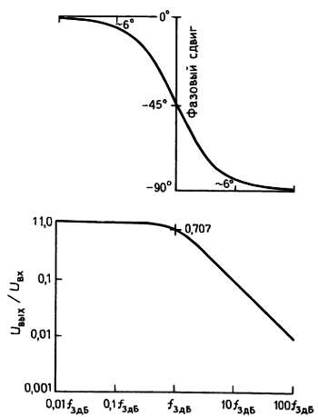 Рис. 1.60. Фазочастотная и амплитудно-частотная характеристики фильтра низких частот, изображенные в логарифмическом масштабе. В точке 3 дБ фазовый сдвиг составляет 45° и в пределах декады изменения частоты лежит в пределах 6° от асимптотического значения.