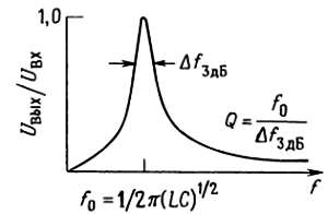 LC-контур в сочетании с резистором R образует делитель напряжения; в связи с тем, что индуктивность и конденсатор противоположным образом реагируют на изменение частоты, импеданс параллельной LC-цепи на резонансной частоте f0 = 1/2π(LC)1/2 стремится к бесконечности - на характеристике при этом значении частоты должен наблюдаться резкий всплеск. График такой характеристики представлен на рис. 1.63.
