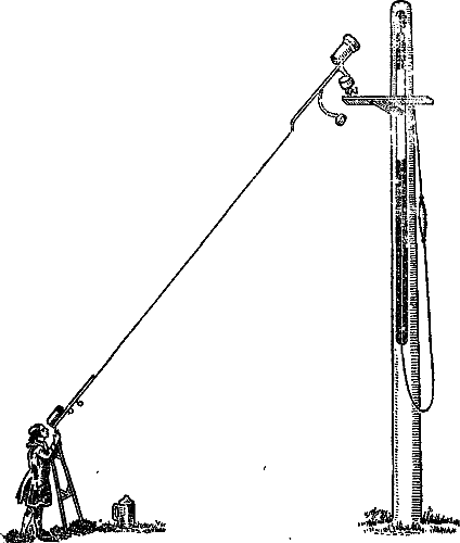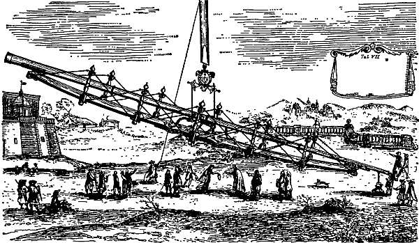 Удивительный облик имели длиннофокусные телескопы XVII и XVIII веков (рис. 14). Их трубы длиной в 30, а иногда и 40 метров с помощью сложной системы блоков укреплялись на высоких мачтах, а наблюдатель окулярную часть телескопа держал в руках. Трубы сравнительно коротких телескопов (примерно до 30 м) делались сплошными, а более длинные — ажурными. Управлять таким телескопом было очень трудно и потому при наблюдениях астроному помогали несколько ассистентов. Из-за суточного движения и маленького поля зрения астрономические объекты непрерывно ускользали от глаз наблюдателя, который должен был непрерывно перемещаться по земле (примерно на четверть метра в минуту). Порой и вовсе отказывались от тубуса (трубы) телескопа, предпочитая «воздушную систему». В этом случае объектив укреплялся высоко на мачте, а окуляр наблюдатель держал в руках! Для удобства наблюдений (если вообще здесь можно говорить о каком-либо удобстве) оправа объектива соединялась с окуляром специальным шнуром (рис. 15). Воздушные телескопы, эти динозавры телескопической техники, достигали иногда поистине исполинских размеров. Так, например, Ян Гевелий, знаменитый польский астроном XVII века, работал с воздушным телескопом длиной около 50 м; Христиан Гюйгенс, голландец по происхождению, большую часть жизни проведший во Франции, пользовался воздушным телескопом длиной 64 м. Но все эти рекорды были побиты А. Озу, который в 1664 году во Франции соорудил воздушный телескоп длиной 98 м. По длине телескоп Озу остался чемпионом и доныне. Но качества его были так плохи, а наблюдать с ним было так неудобно, что в изучений Вселенной Озу не сделал ни одного открытия.