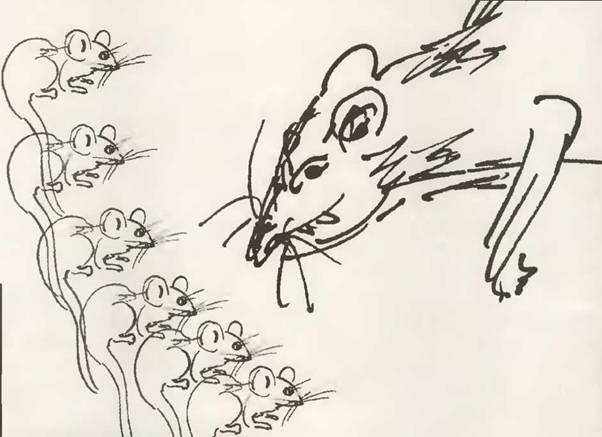 Крысы отважны и умеют найти выход из сложной ситуации. Даже если их сажают на шкаф с посудой, на полку, на абажур… Была такая игра у одного моего знакомого ребенка. И что же – Маргошка и Роня всегда находили выход! Они могли съехать по полированной поверхности, как с горки, а на полпути оттолкнуться лапками и спрыгнуть вниз. Могли спуститься по висяшей одежде. Если между задней стенкой шкафа и стеной оказывалась достаточная шель, то крыса шла вниз пешком, упираясь спиной в одну поверхность и топая по другой. Наконец, в крайнем случае она прыгала, точно оценивая расстояние до самого высокого из доступных мест комнаты. Иногда самым высоким местом оказывалась чья-нибудь голова, что не очень смущало крысу. Так же в похожей ситуации поступает «дикий» пасюк, и тогда все говорят, что «крыса бросилась на человека». А она просто выбрала единственный путь к отступлению.