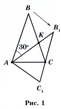 7. Равнобедренный треугольник ABC с основанием АС поворачивают вокруг точки А на угол 30°, при этом точка В переходит в точку В1, точка С — в точку С1, а отрезок В1С1 проходит через точку С (рис. 1).