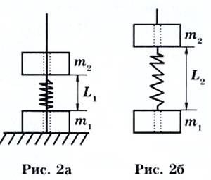 4. Два груза массами m1 = 200 г и m2 = 300 г соединены легкой пружиной и насажены на гладкую вертикальную спицу. Нижний конец спицы упирается в горизонтальную поверхность стола, груз массой m1, находится внизу (рис. 2а).