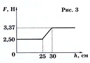 6. Металлический брусок в форме куба подвешен на тонкой невесомой нерастяжимой длинной нити так, что одна из его плоскостей горизонтальна. С помощью динамометра, прикрепленного к другому концу нити, измеряют вес кубика в воздухе и в широком сосуде с жидкостью. Зависимость показаний динамометра от расстояния от нижней грани кубика до дна сосуда изображена на графике (рис. 3).