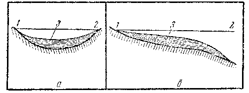 Рис. 7. Разрез геосинклинали; а — внутренняя геосинклиналь; б — геосинклиналь в океане около материка. Цифрами 1–2 показан уровень моря. 3 — толща осадков.