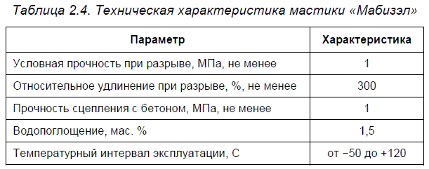 Мастика «Мабизэл» (табл. 2.4) представляет собой композицию, состоящую из битума, эластифицированного синтетическими каучуками, растворителя, функциональных и технологических добавок. Изготавливается и поставляется в виде однокомпонентного состава, что существенно упрощает ее применение.