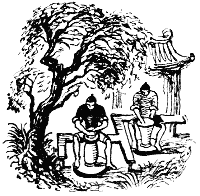 Это были большие бараки, обнесенные забором, на окраине города. Там кипела работа. На одном дворе в больших чанах промывали као-лин и толкли пе-тун-тсе в порошок. Потом смешивали то и другое в больших ямах, выложенных камнем. Размешанное тесто раскатывали в пласты и уносили в подземные погреба. Там масса вылеживалась годами, становясь нежнее и мягче.