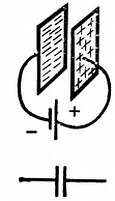 Л. — Два проводника, расположенные близко друг к другу, образуют устройство, известное под названием конденсатора, каждый из проводников называется обкладкой. Представь себе, например, две квадратные медные пластины, расположенные одна параллельно другой на небольшом расстоянии. А теперь подключим каждую из этих обкладок к полюсам батарей. Что же здесь произойдет?