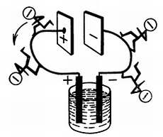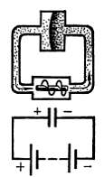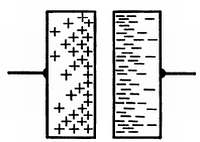 Рис. 24. При подключении конденсатора к гальваническому элементу соединенная с отрицательным полюсом обкладка заряжается электронами, а другая лишается электронов.