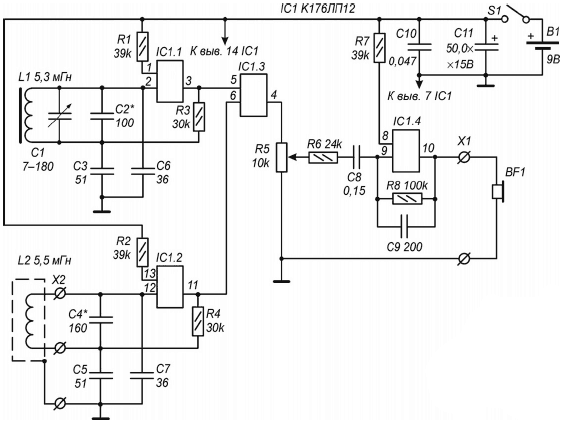 Рис. 3.8. Принципиальная схема металлоискателя на микросхеме К176ЛП2